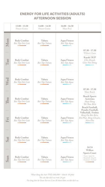 - 16:00 – 16:30 | Monday – Sunday | Aqua Fitness